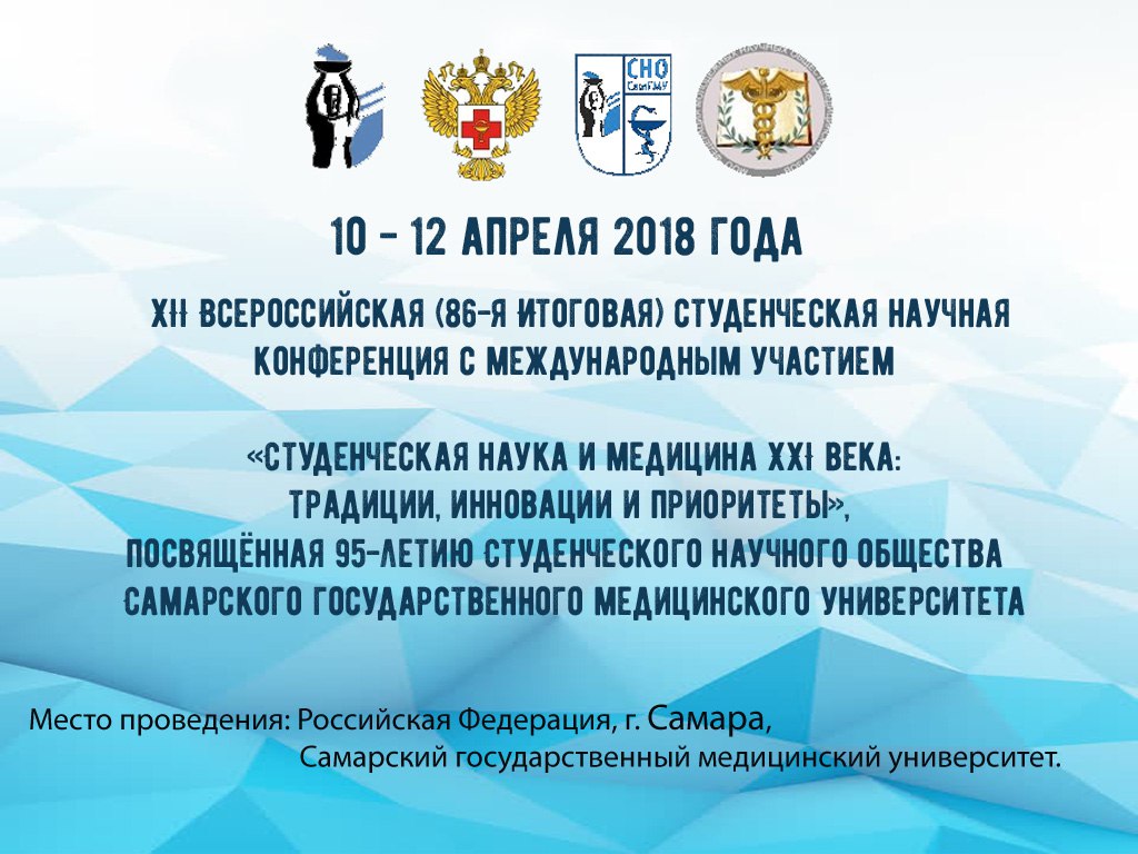 Студенческое научное общество Самарского государственного медицинского университета объявляет о начале приема заявок для участия в XII-ой Всероссийской (86-й Итоговой) студенческой научной конференции с международным участием «Студенческая наука и медицина XXI века: традиции, инновации и приоритеты», посвященной 95-летию СНО СамГМУ.