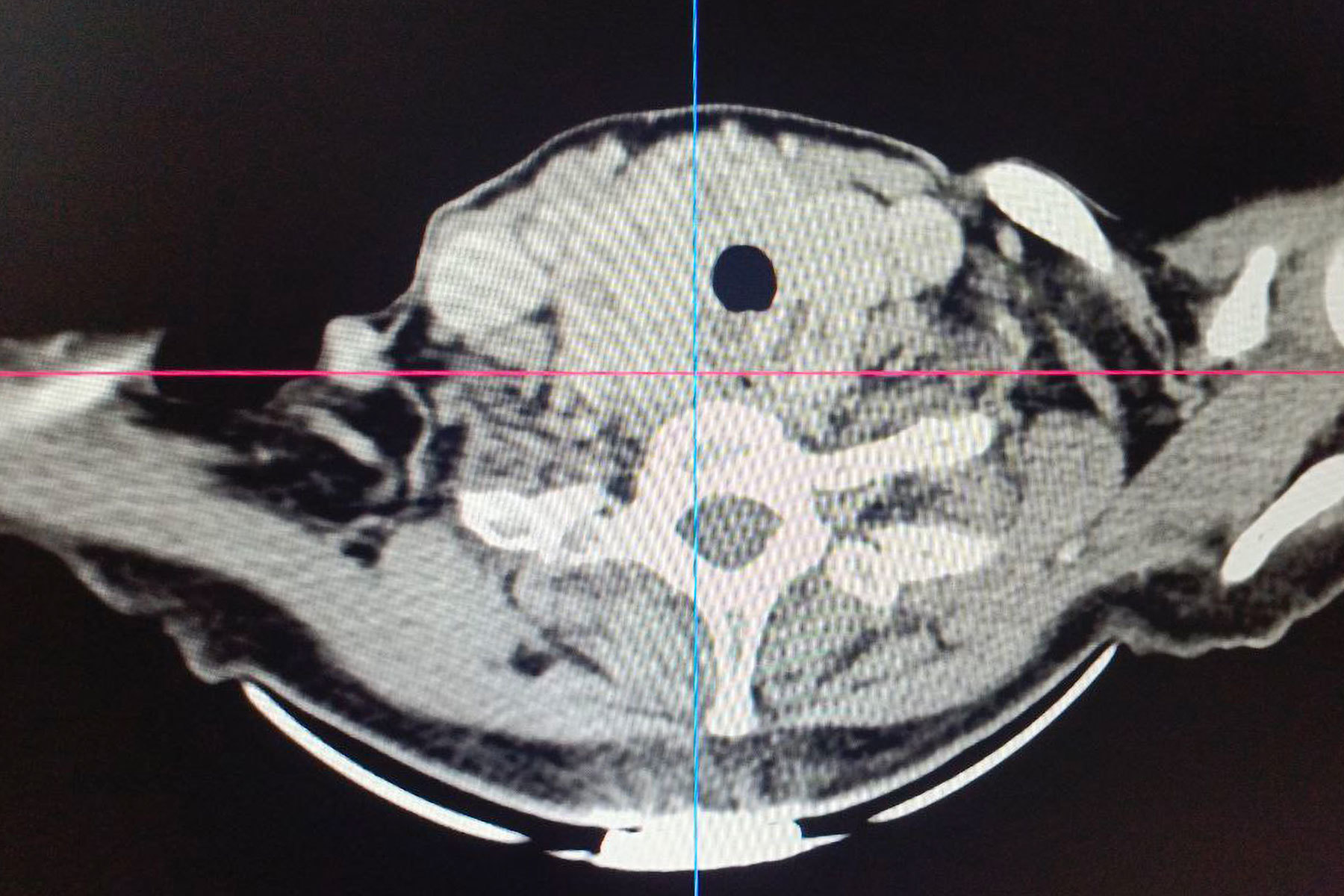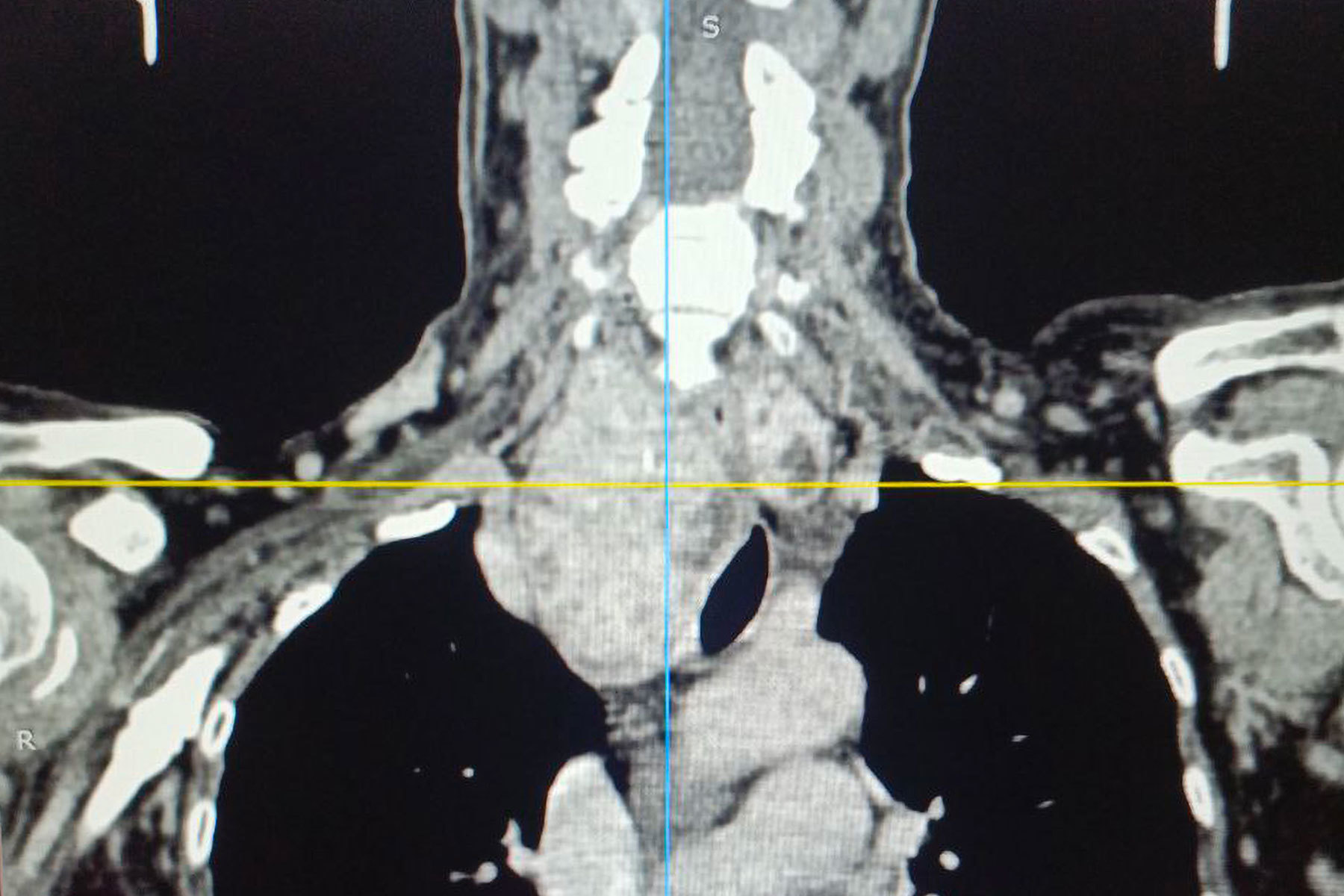 Особую сложность представляло анатомическое расположение зоба. По словам хирурга, расположение зоба было частично загрудинным, образование опускалось за грудину примерно на две трети. А правая доля щитовидной железы подходила вплотную к плечеголовному стволу — крупному артериальному сосуду. Кроме того, зоб циркулярно охватывал трахею, сдавливая ее со всех сторон и вызывая у пациентки затруднение дыхания даже при небольшой физической нагрузке.