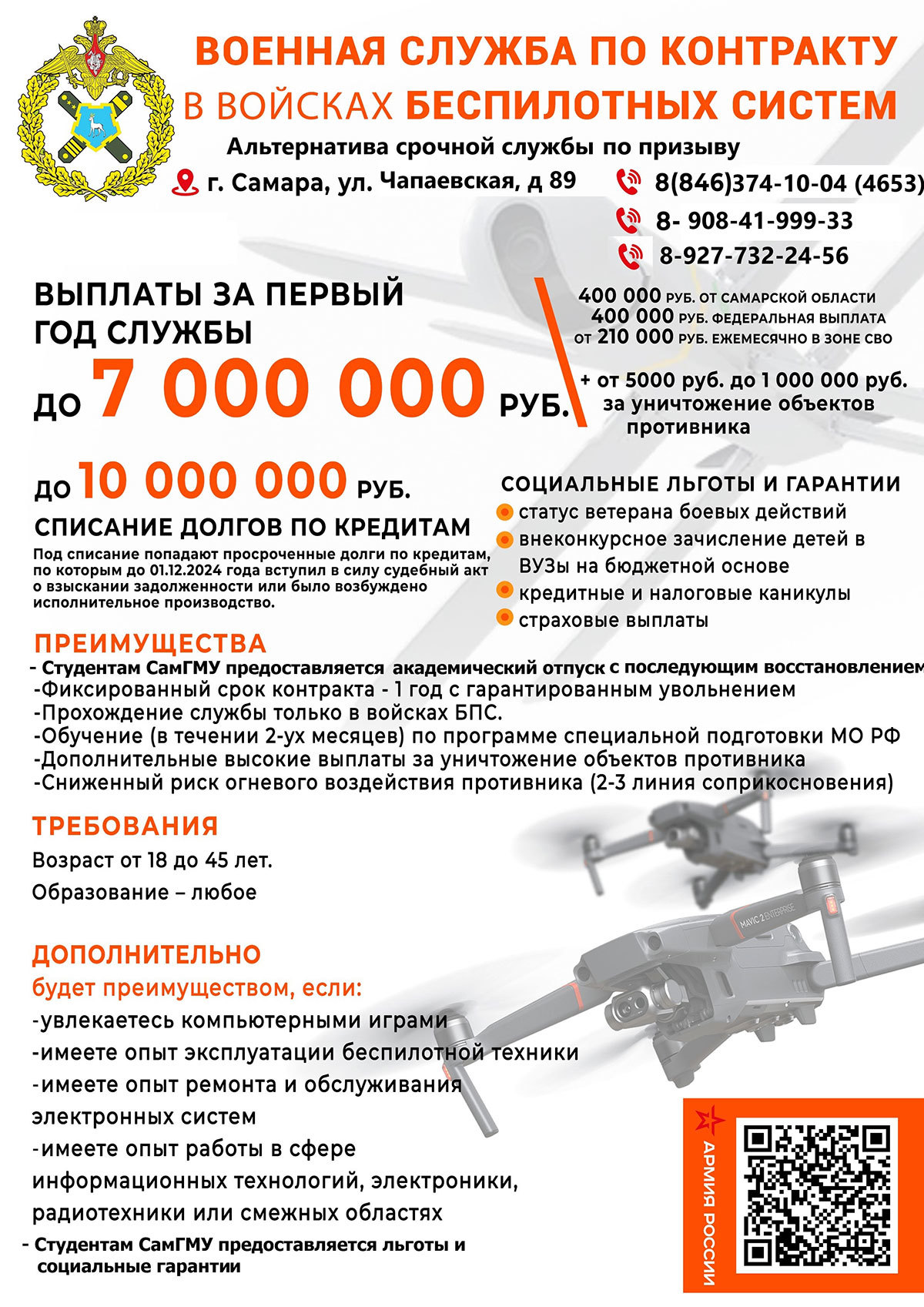 Приглашаем рассмотреть возможность заключения контракта продолжительностью 1 год с последующим гарантированным увольнением из Вооруженных сил России (ВС РФ). Войска беспилотных систем — это новый род войск в структуре ВС РФ, созданный специально для проведения боевых операций с использованием беспилотных комплексов различного профиля и назначения. При заключении годового контракта студентам СамГМУ предоставляется гарантированный академический отпуск с последующим восстановлением, а также предоставляются льготы и социальные гарантии.