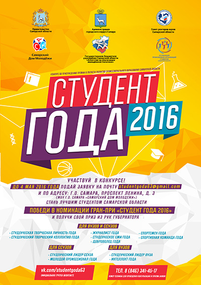 «Студент года» — конкурс, который уже в пятый раз определяет лучших студентов региона и поощряет их за активные действия, направленные на развитие образования, науки, спорта, культуры, творчества, общественной и волонтерской деятельности на территории Самарской области.