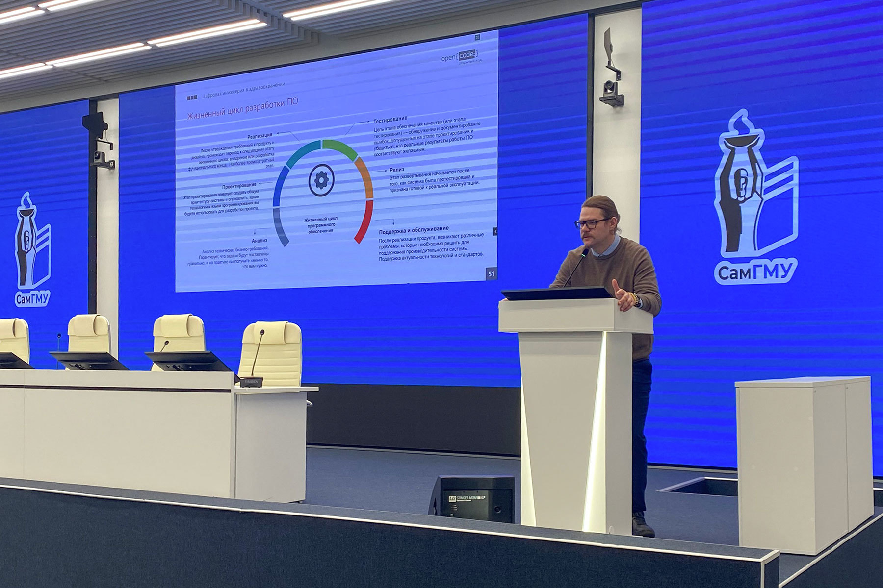 Семинар провели эксперты многолетнего партнера университета — компании «Открытый код». В ходе занятия студентам подробно рассказали об этапах жизненного цикла разработки программного обеспечения, об основных направлениях применения технологий искусственного интеллекта, а также о ключевых особенностях разрабатываемых инновационных проектов для отрасли здравоохранения. У участников была уникальная возможность на примере реальных кейсов разобрать нюансы подготовки медицинских