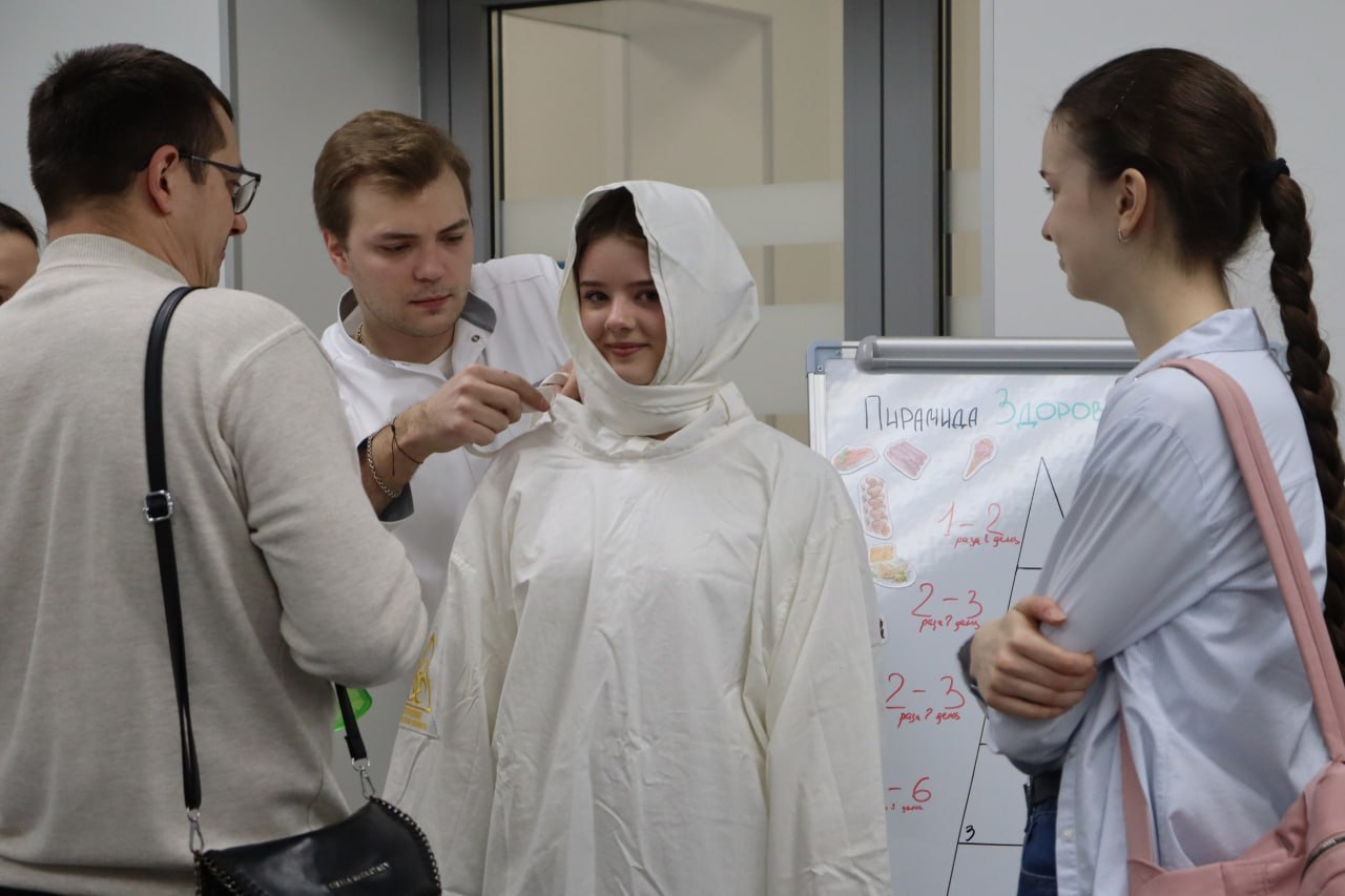 Абитуриенты примерили защитные медицинские костюмы, послушали сердцебиение плода, научились измерять давление, накладывать повязки, познакомились с пирамидой питания и провели химические опыты.
